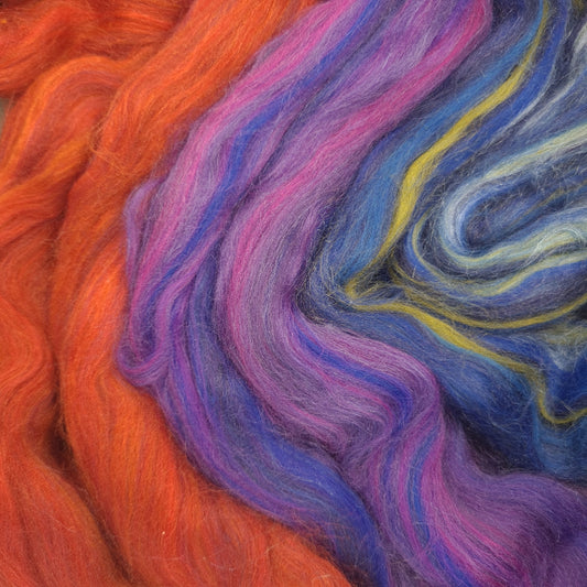 Dyed corriedale wool combined with natural UK Alpaca and recycled sari silk gives you combed top with textural interest as well as pretty colours!