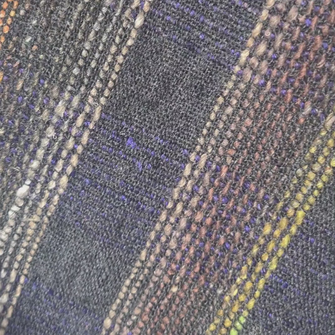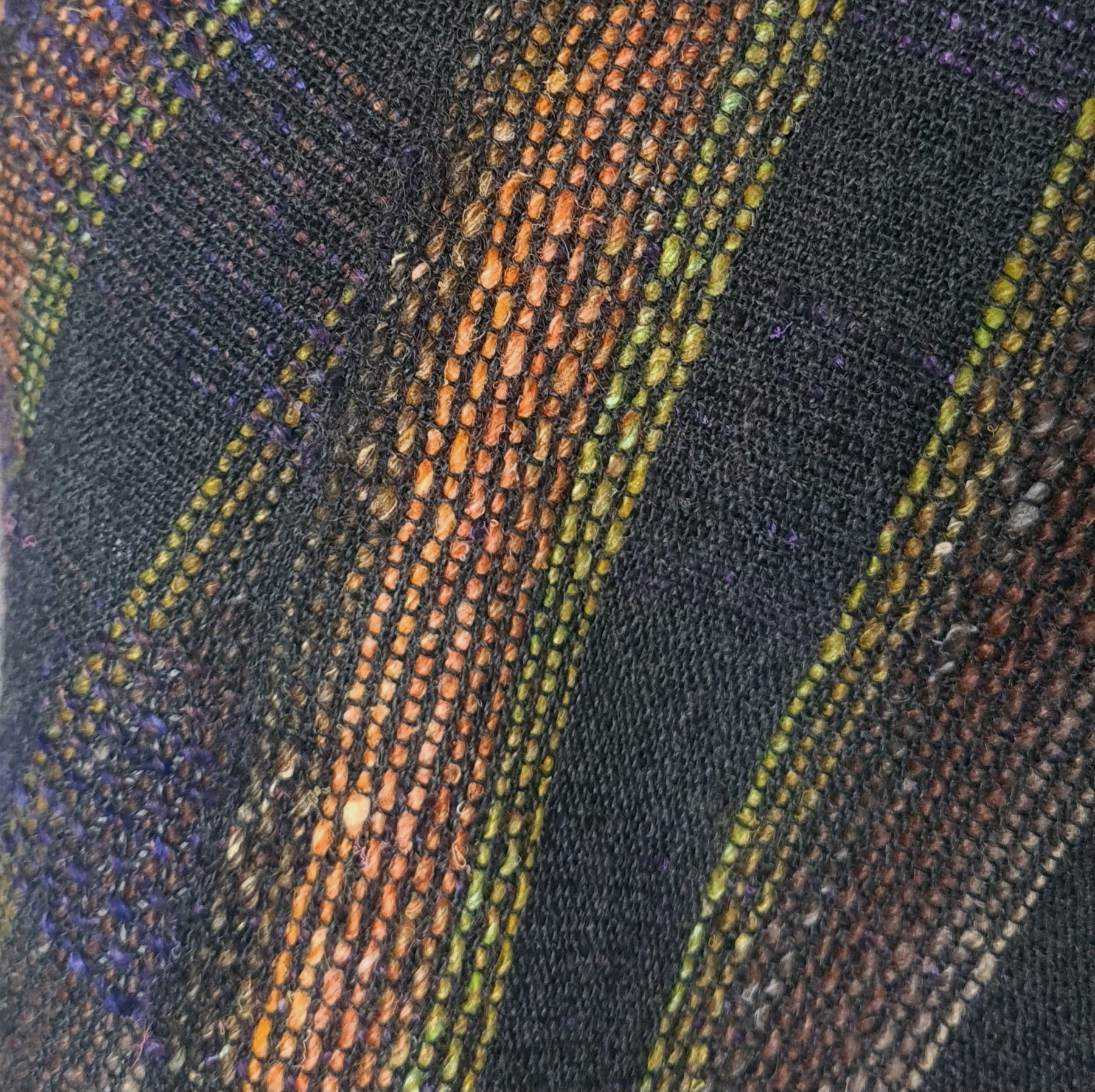 This scarf has the same dark charcoal background as the Charcoal & Pink scarf but this time it's orange, lime and green stripes running the length of the scarf. The weft (width wise) stripes work through purple, brown, burgundy, green and back to purple again