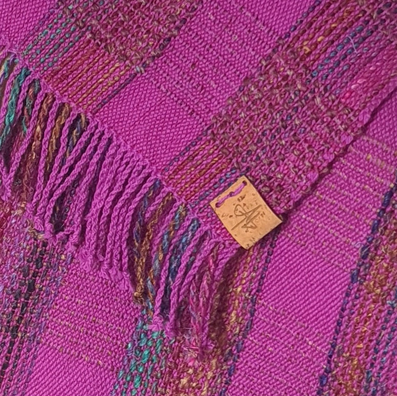 The scarf has a base of magenta organic cotton which makes it a perfect Summer cover up. The jewel contrast colours come from a yarn which is 45% silk, 45% mohair and 10% lambswool which adds texture as well as contrast