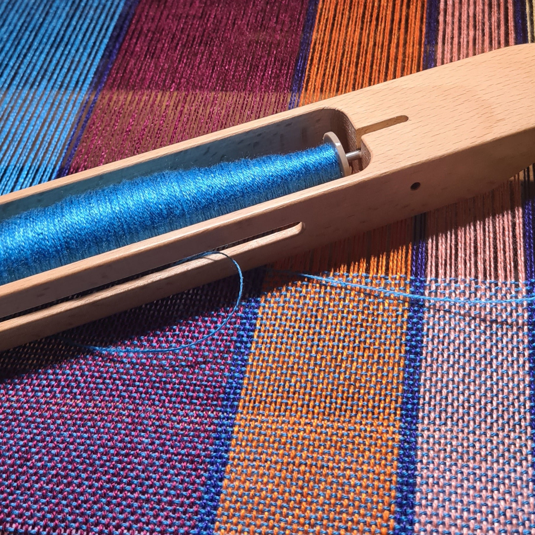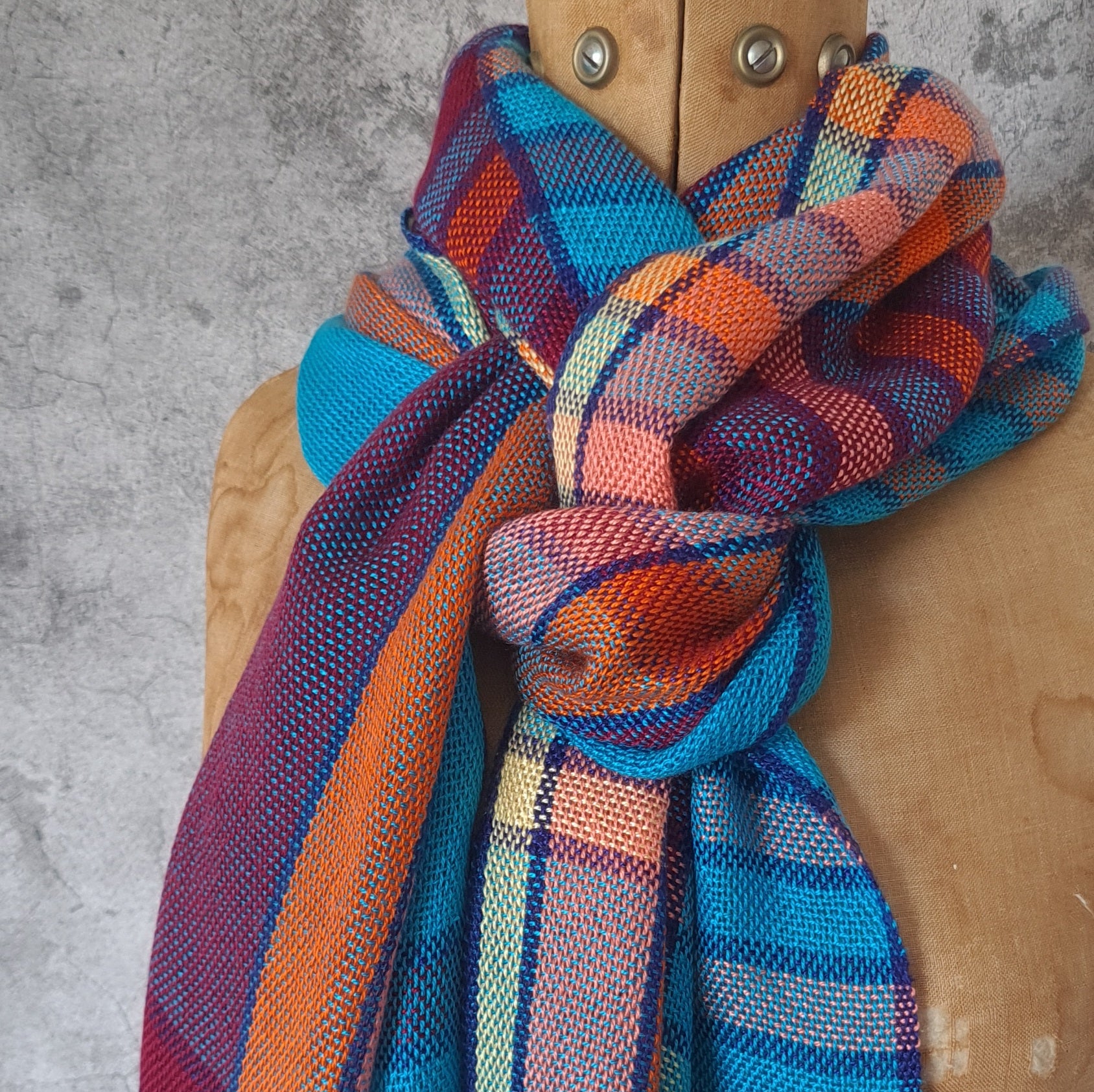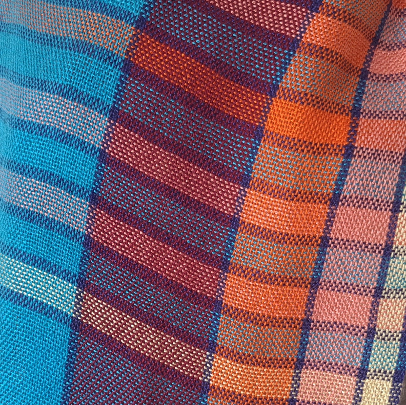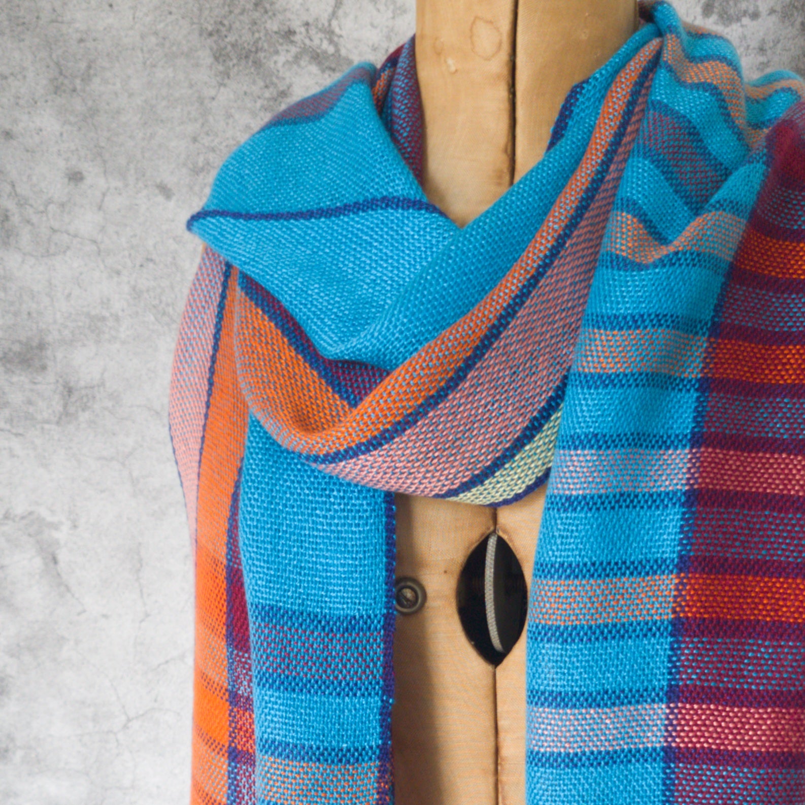 This a bold shawl woven in turquoise, dark red, orange, coral, yellow and navy blue. The vertical stripes run the length of the scarf with a series of stripes, all bordered in navy blue, at one end and a coordinating accent at the other