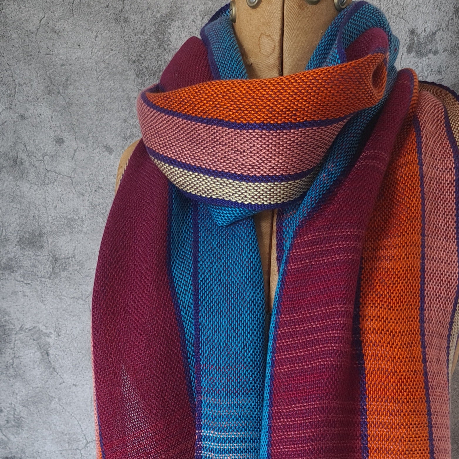 This a bold shawl woven in turquoise, dark red, orange, coral, yellow and navy blue. The vertical stripes run the length of the scarf with a series of narrow stripes, in shades of red and pink at one end and a coordinating accent at the other. The main section of the shawl is woven in purple