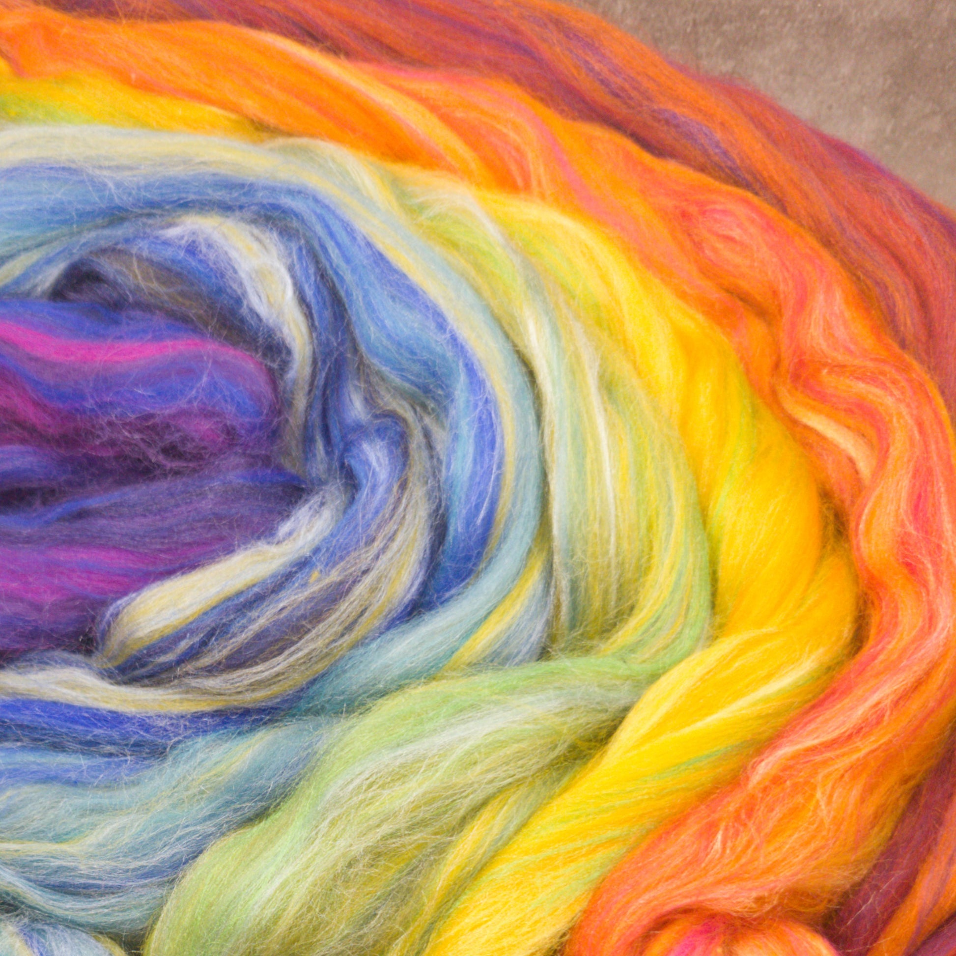 Combining super fine merino with 28% tussah silk makes my Downend Blend a real luxury fibre to spin. Lemon, lime, Mandarin, Grapefruit - they're all in this tangy blend. The orange from Fruit Salad and lime from Green Meadow makes this the perfect fit in the 'Downend Rainbow' without being overly yellow