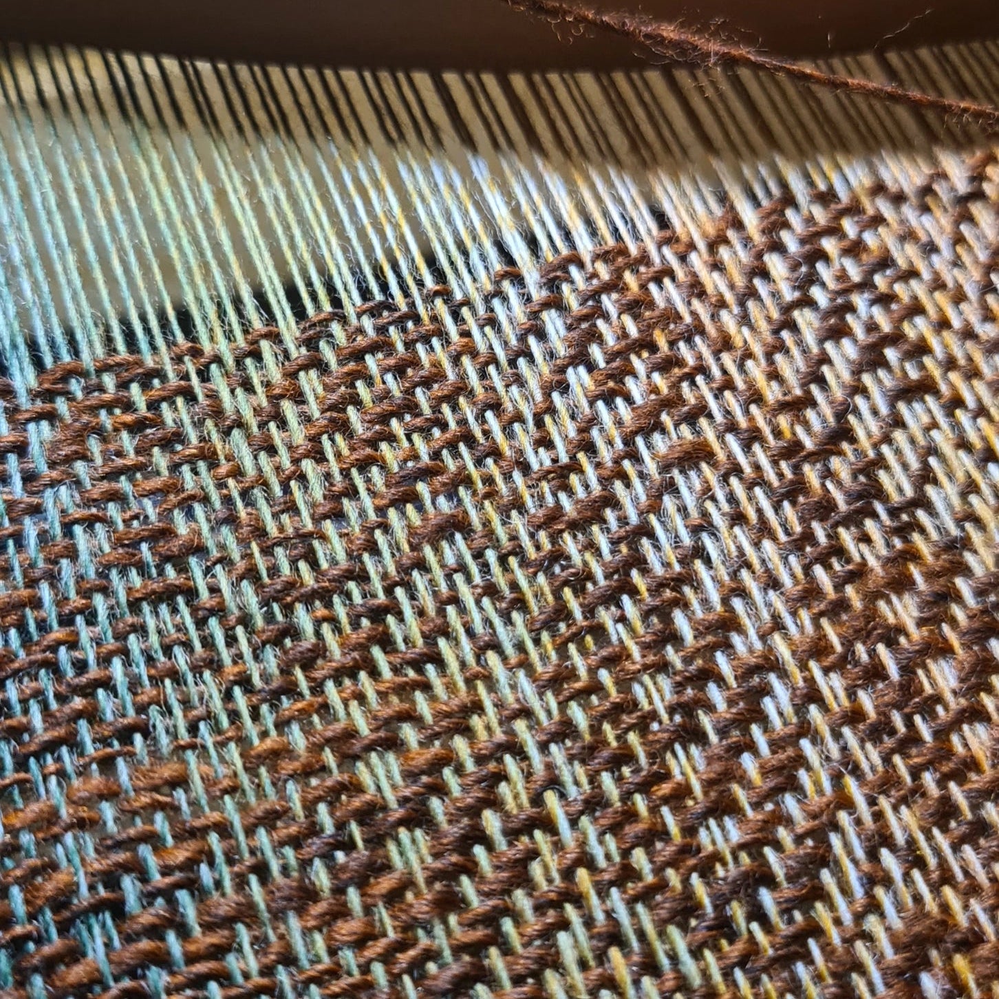 Woven on my pre-loved Harris table loom this scarf this 8 inch wide scarf is covered in leaf details. Or are the pinecones? I couldn't decide as I was weaving! Either way the scarf has a gradient of oranges and greens across the warp and is woven with a handspun copper yarn in pure merino. This is one of three scarves woven from the same warp, you can find the others here