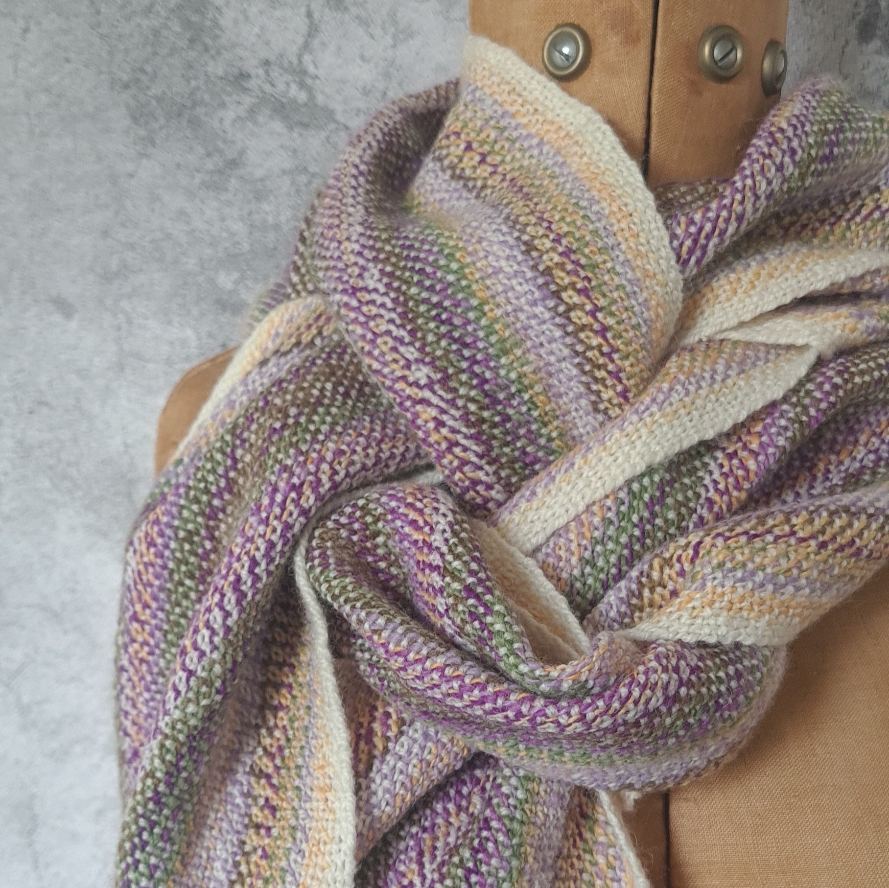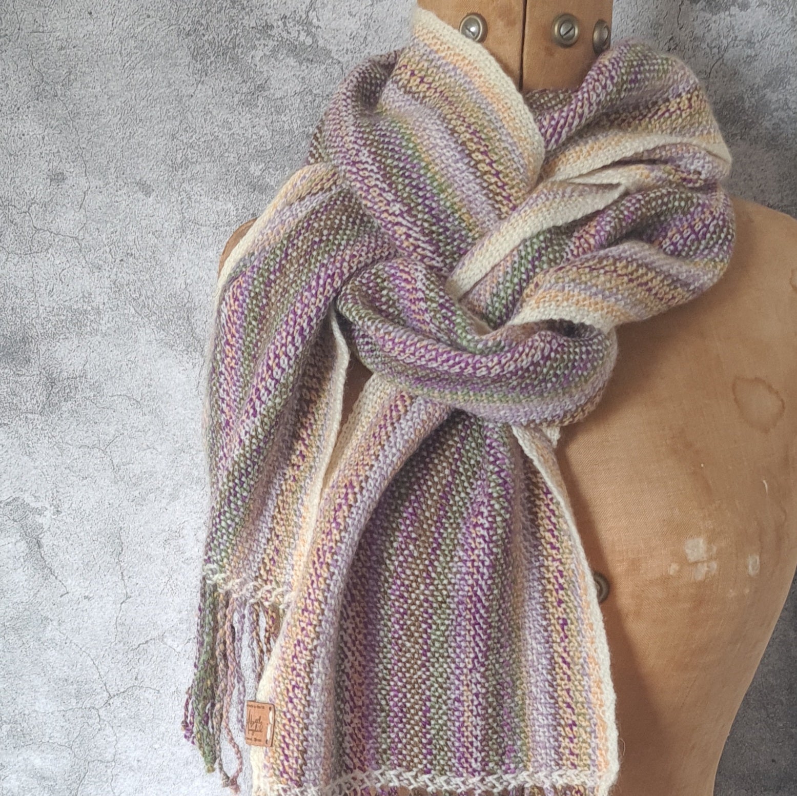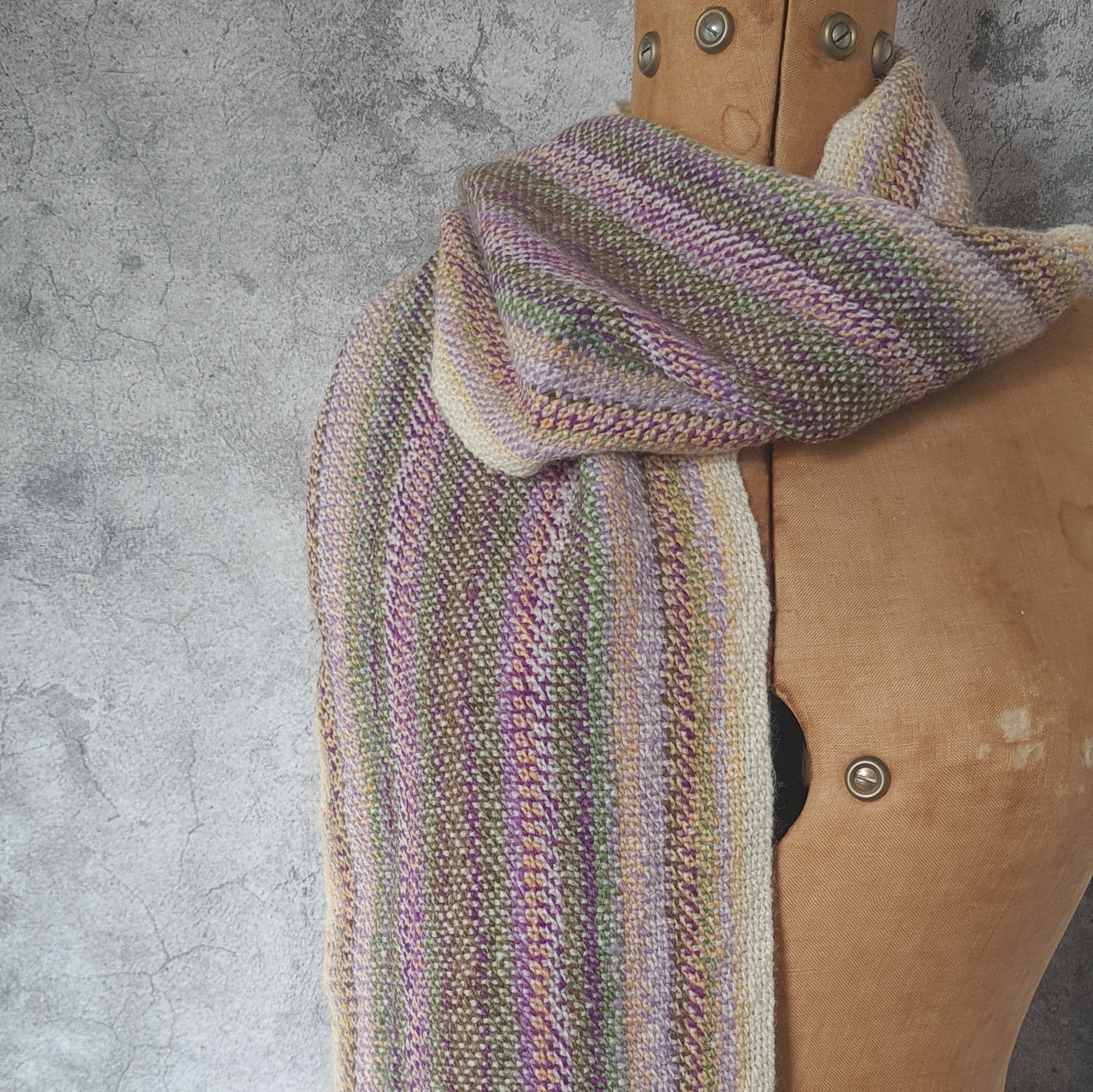 The finished scarf is pretty stripes of crocus colours - Purples, lilac, yellow and greens against an undyed, natural background
