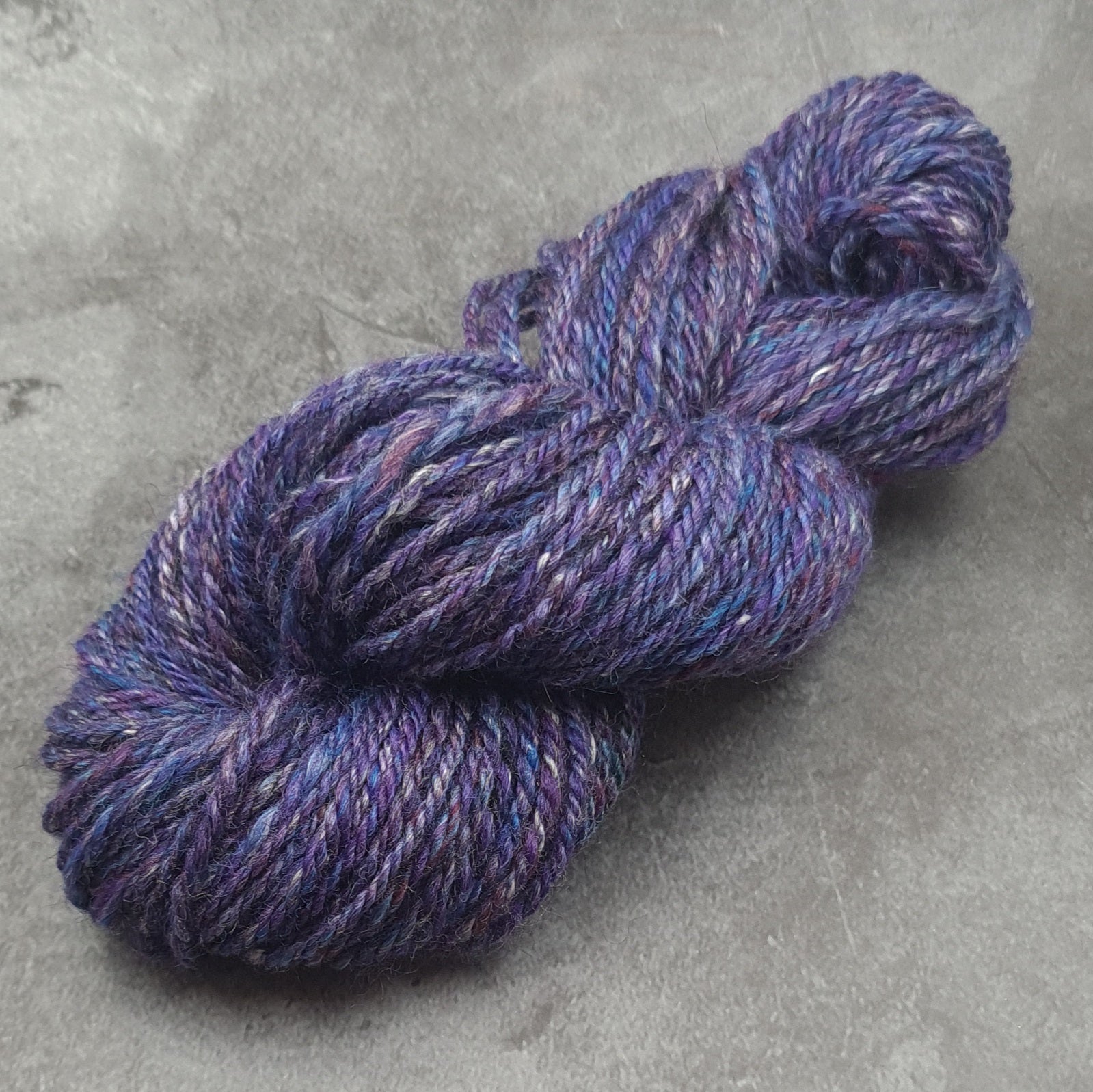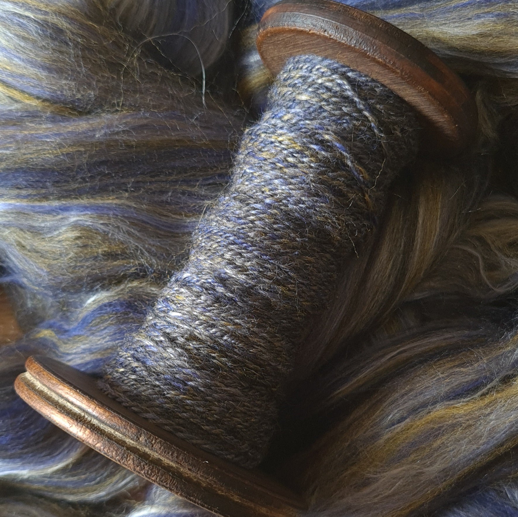 The merino is sourced from a non-mulsed flock. Dyed in Yorkshire and blended in Devon before being spun in Hampshire by me!