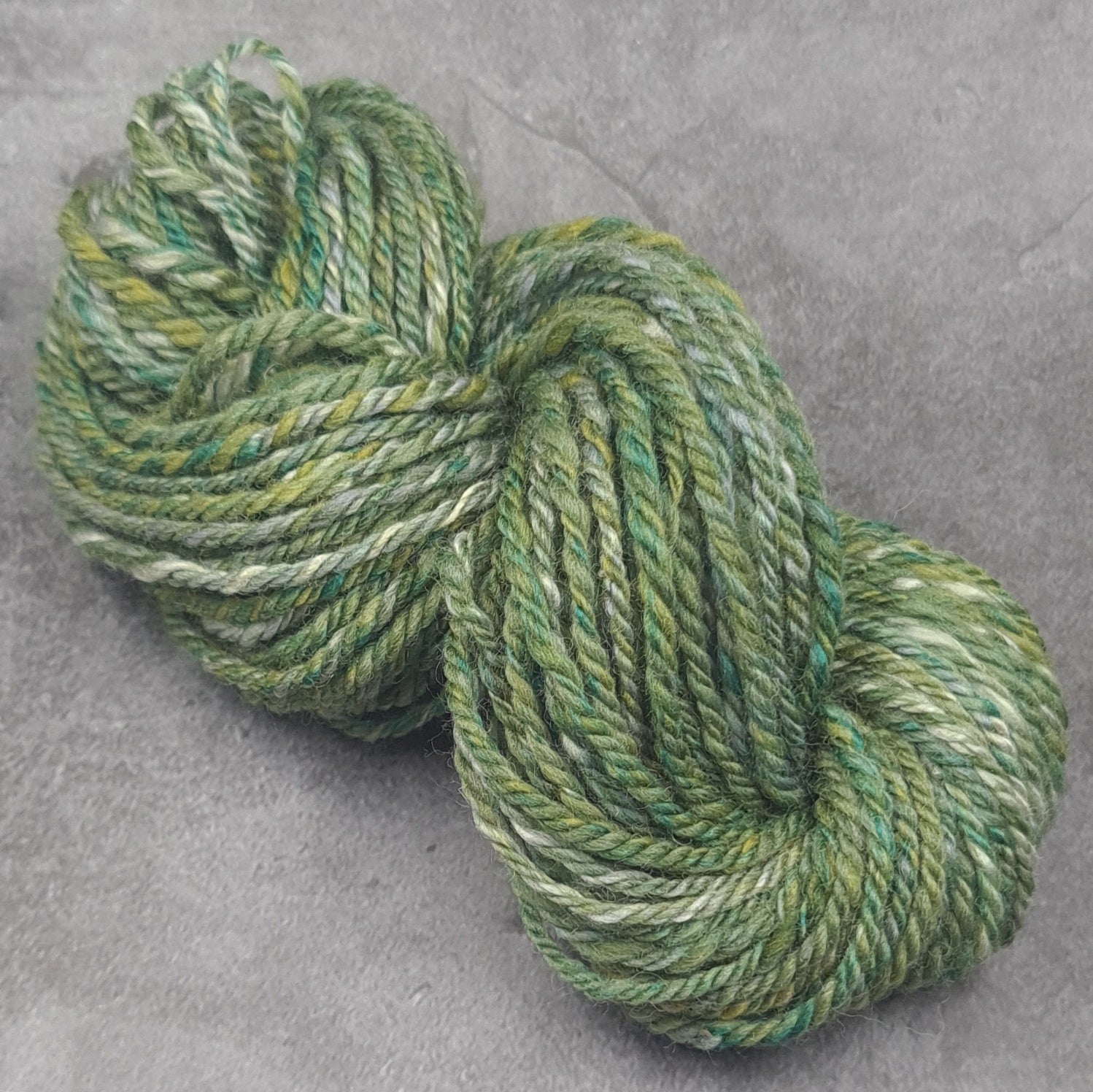 Olive greens with grey, 25g, 32m (45 yds) 10 wpi Olive green merino with teal, greens and greys blended with two shades of dyed bamboo fibre