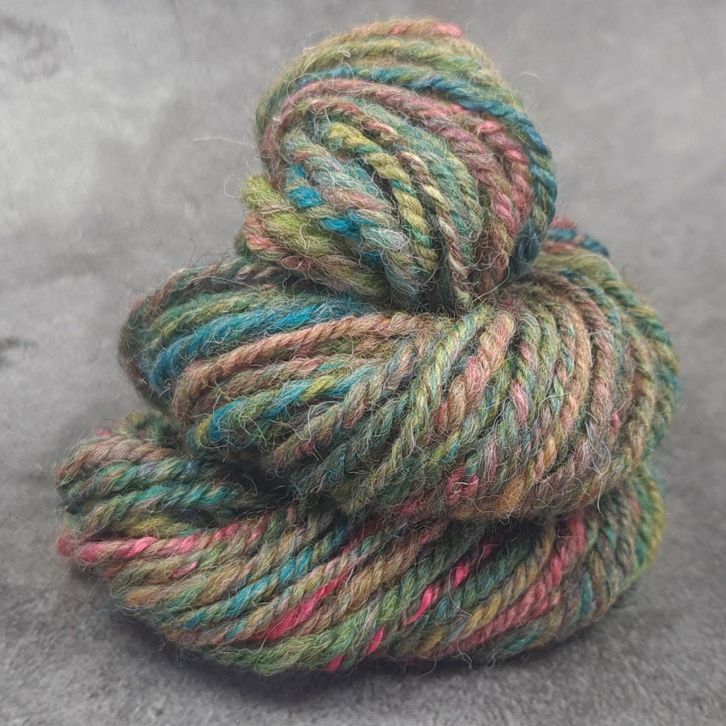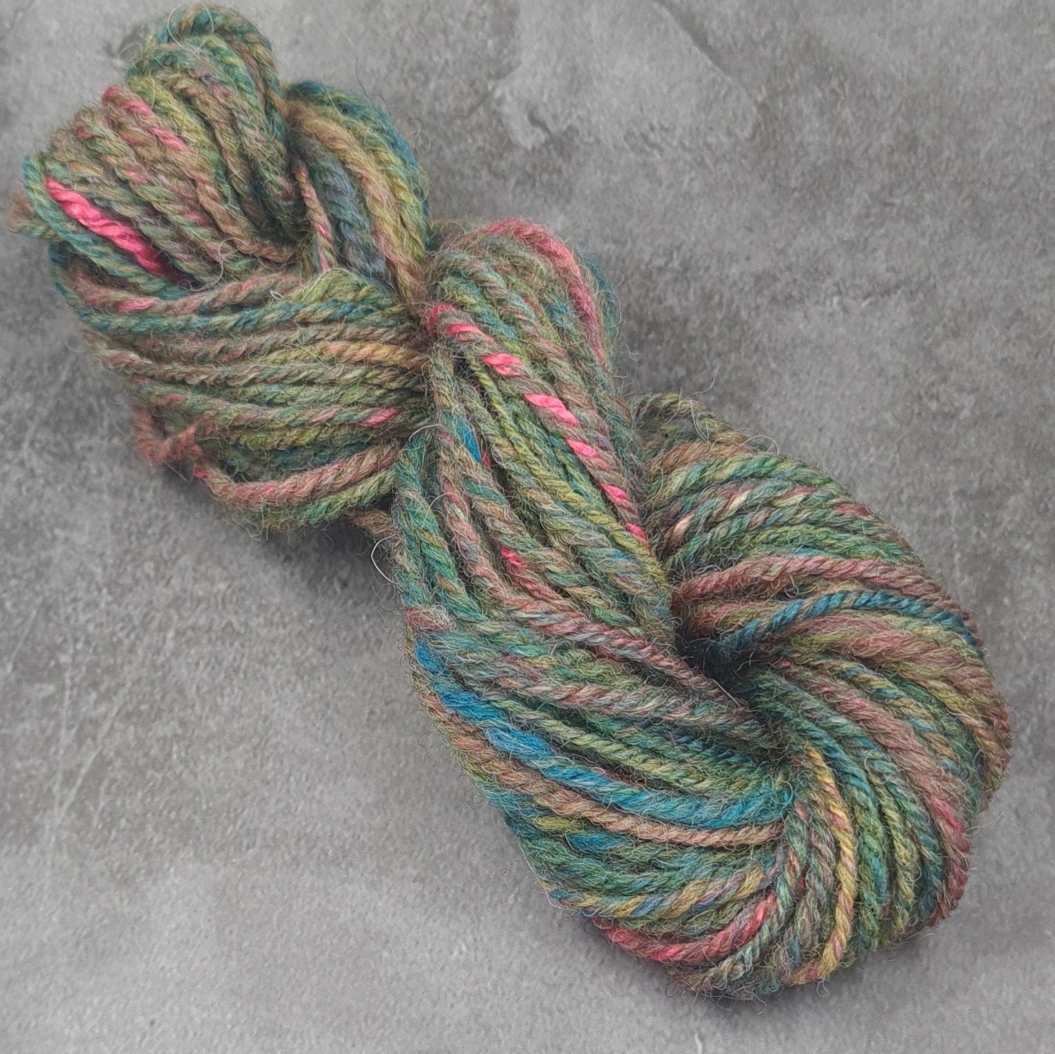 Handspun from rolags/punis using my vintage Ashford wheel and chain plied to give a light airy yarn with pops of colour and texture. All these yarns have a soft handle but they do vary in texture according to the sheep breeds used.