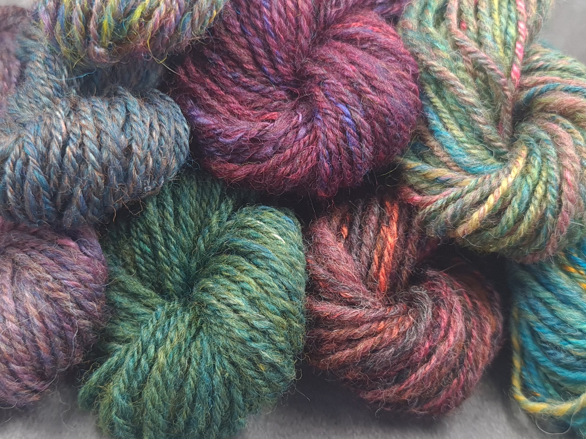 These are all aran or worsted weight yarns (9-12 wraps per inch) with a suggested tension/gauge of approximately 20 stitches and 28 rows to 10cm/4" on 4.5mm needles. Combine them with each other, other colours of my handspun aran or other yarns of similar weight.