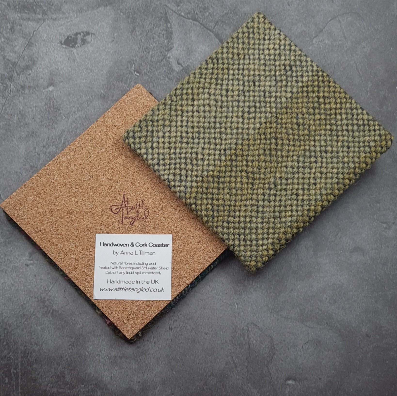 These handmade coasters measure 10x10cm and are treated with 3M Scotchguard Water Shield to repel any spills. You can see in the video how effective this is, just dab off any spills that do happen as soon as you can. To keep your coaster in tip top condition you may wish to re-treat it every year or so.