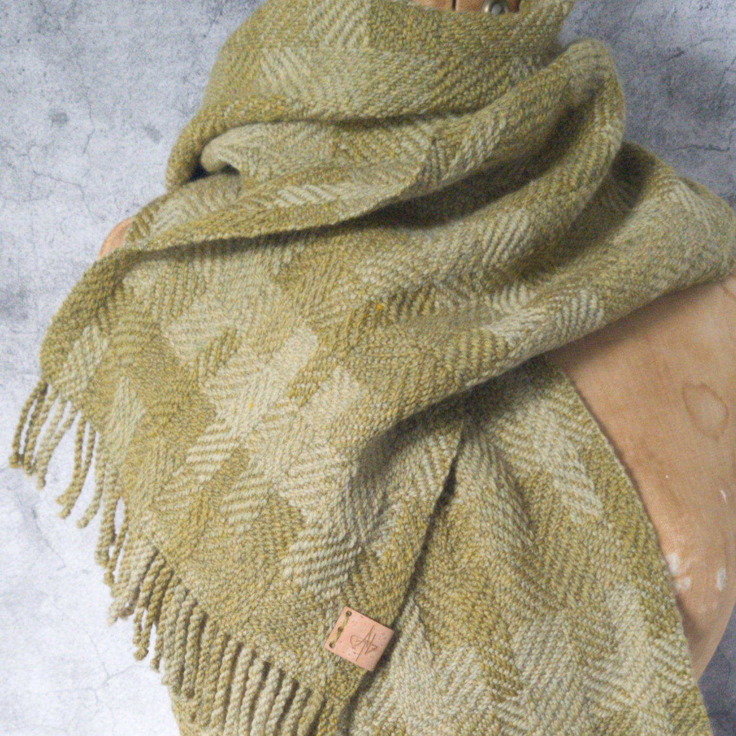 Woven on my pre-loved Harris table loom this scarf has 4 shades of olive in the pure warp and 2 in the weft. As I wove the scarf I switched between the twill patterns and colours of weft to give a variety of subtly different blocks. The scarf is 23cm wide and 166cm long, including a 5cm fringe at either end.