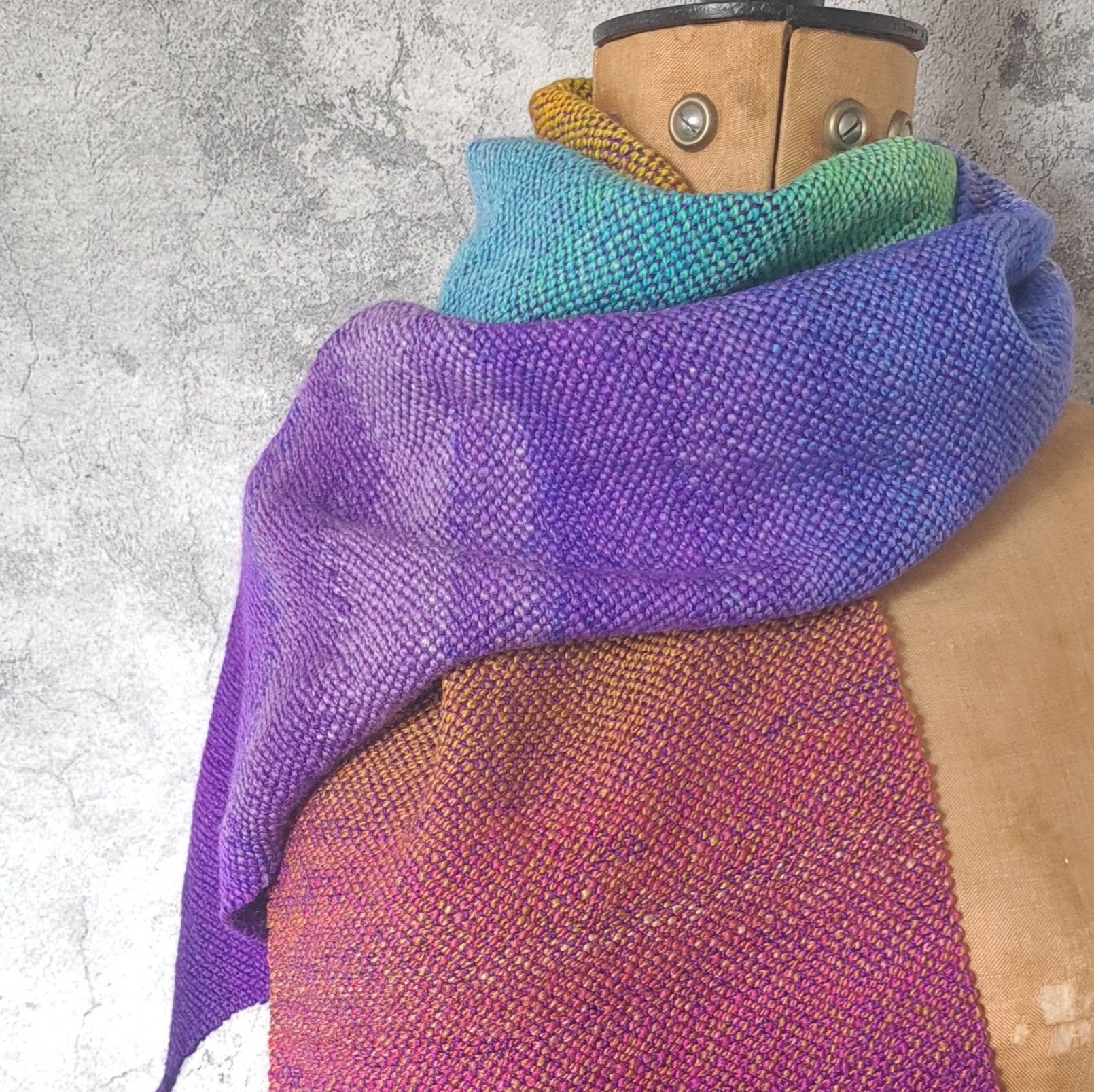 I collected together several hand dyed merino and silk tops and spun them in a vaguely rainbow order to create the weft for this scarf. The result moves from purple, through lilac to blue, then to green via turquoise before finally working through orange and red to reach magenta - it's got a bit of everything! The lighter weight purple warp gives a hint of purple throughout but the hand spun yarn is the star in this one off piece