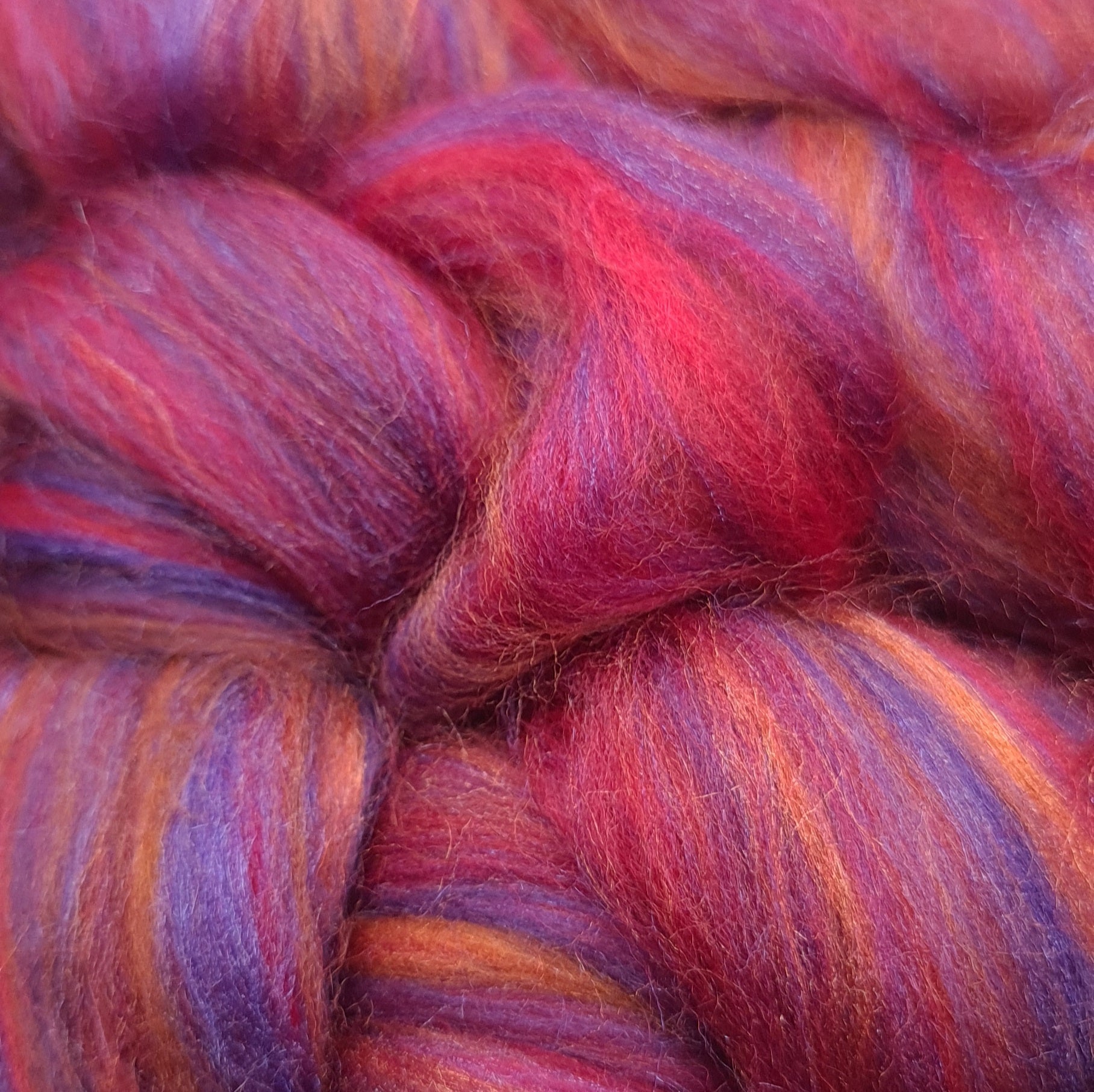 Combining super fine merino with 28% tussah silk makes my Downend Blend a real luxury fibre to spin. Red Velvet is a deep and inviting red with touches of orange and purple