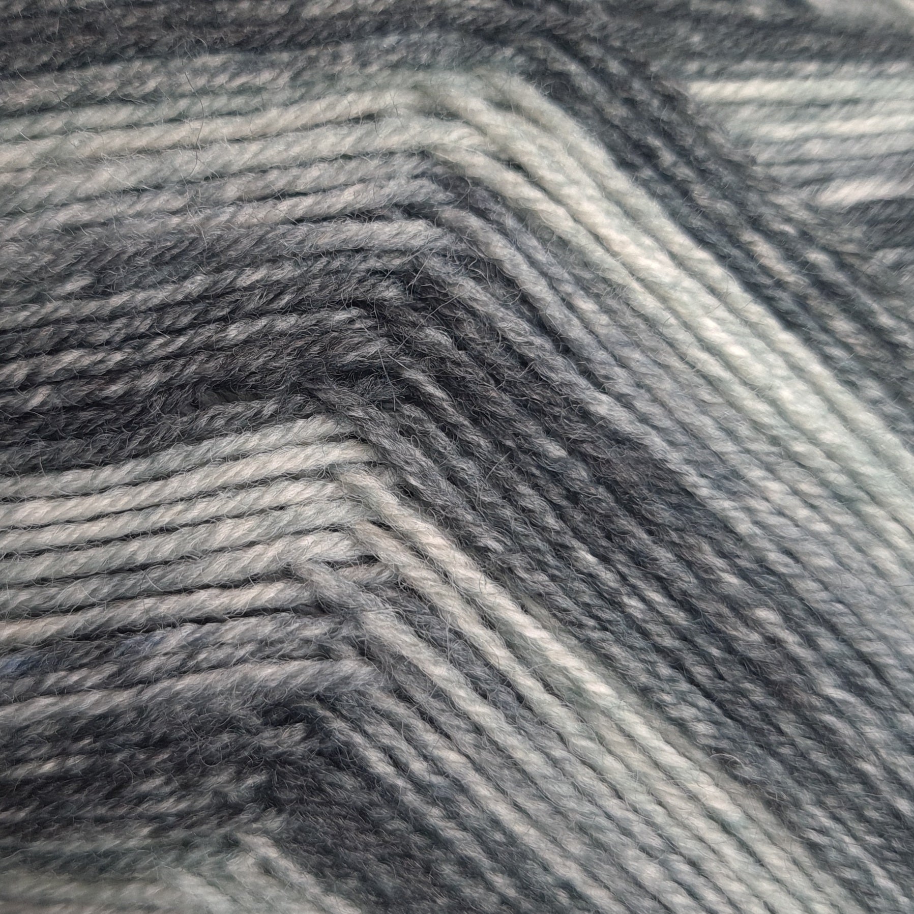 Unlike many more 'fairisle' self patterning sock yarns this range has gentle, blended transitions between the wide bands of colour. Each one includes a dark grey and a light grey stripe plus one contrast colour